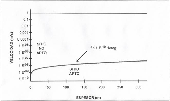 Estos parámetros del sitio se deben representar en la gráfica antes mencionada, para determinar su aptitud y viabilidad. Los sitios aptos, son aquellos donde el factor de tránsito de infiltración sea: f < 1x10-10 seg-1.