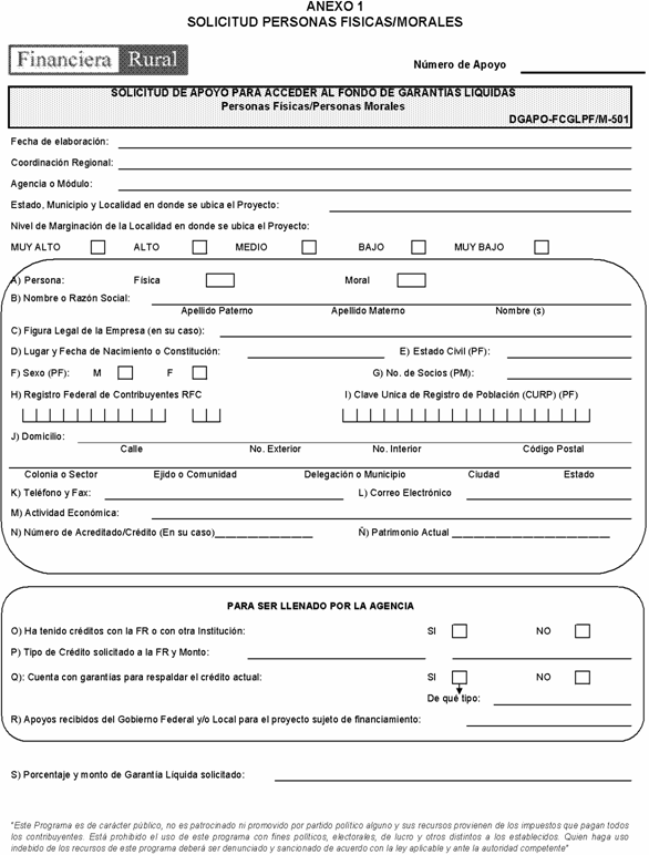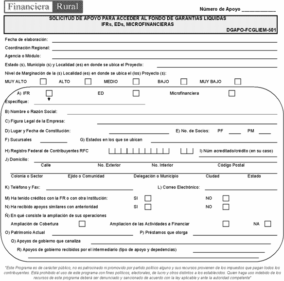 iii. Que el solicitante presente el formato DGAPO-FCGL-501, “Solicitud de apoyo para acceder al Fondo de Garantías Líquidas” para personas físicas y morales o para IFR, ED o Microfinancieras, según sea el caso, anexo a las presentes Reglas (Anexo 1) debidamente requisitado, así como toda aquella información que permita dar cumplimiento a las disposiciones aplicables en el Decreto por el que se crea el Sistema Integral de Información de Padrones de Programas Gubernamentales publicado en el Diario Oficial de la Federación el 12 de enero de 2006.