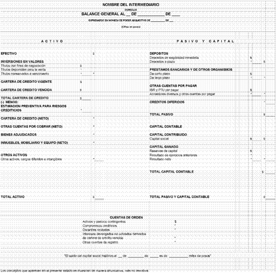 El presente lineamiento tiene por objetivo establecer las características generales, así como la estructura que debe tener el balance general, con el propósito de homologar la presentación de este estado financiero entre las sociedades. 1